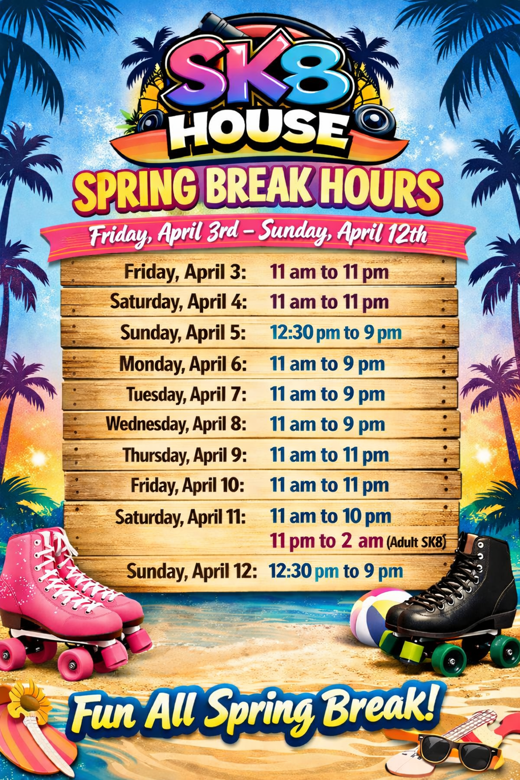 Open 7 days a week with skating thrills, themed nights, and unforgettable parties. Enjoy bites from 3 local food vendors and win big in the arcade.